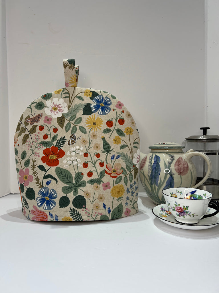 Fabric: Each tea cozy is handmade using premium Rifle Paper Co Linen Canvas in Strawberry Fields Midnight outer fabric.